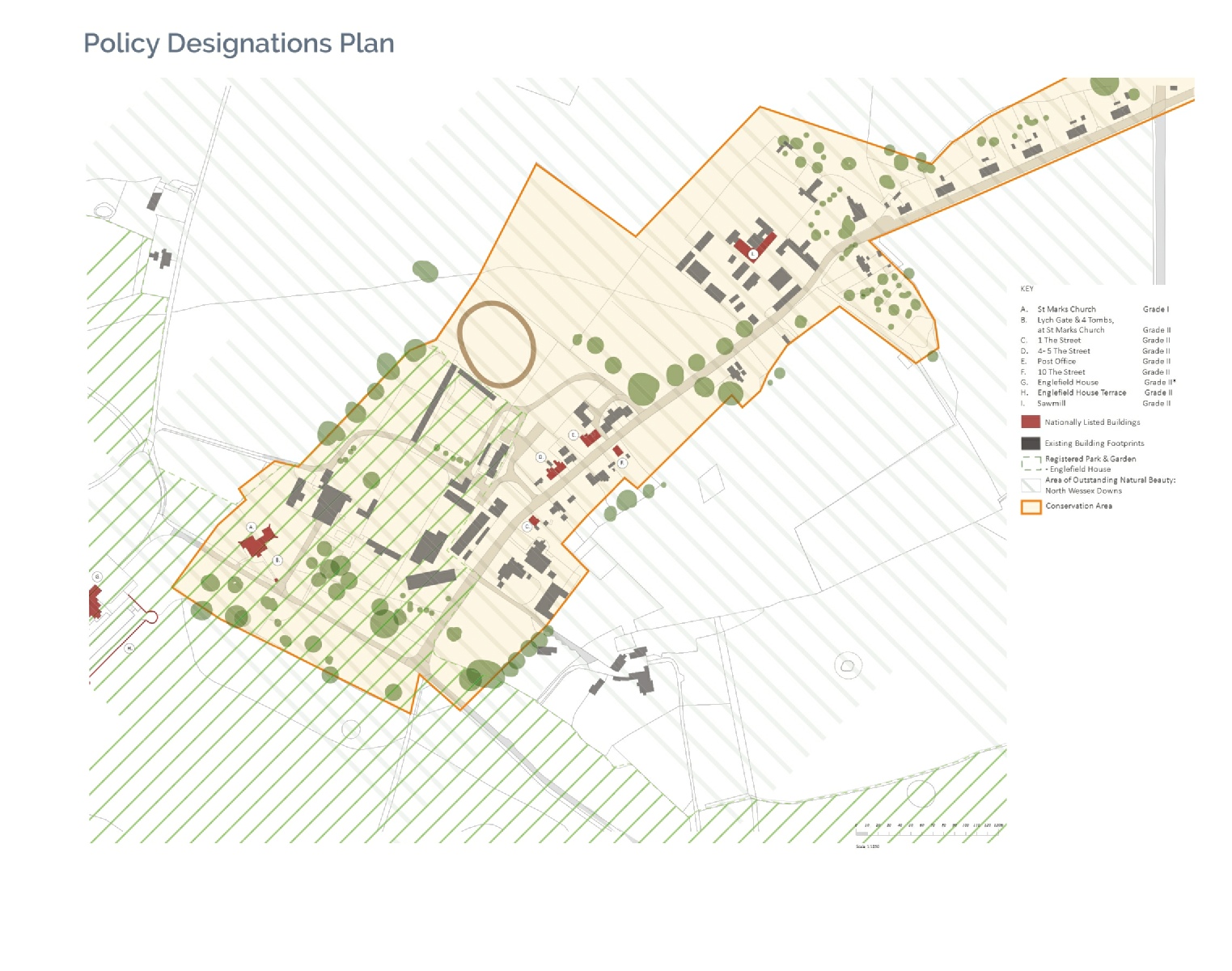 The majority of Englefield village, along with the House and part of its gardens, is designated as a Conservation Area - an area considered worthy of preservation or enhancement because of its special architectural or historic interest. Within this there are a number of buildings individually listed, as shown on this map, along with the Boundary Stone at SU 6318 7240 (A340) (Grade II) and the Boiler House, Chimney, Sawmill and Joiner’s Shop in the Estate Yard (Grade II).
